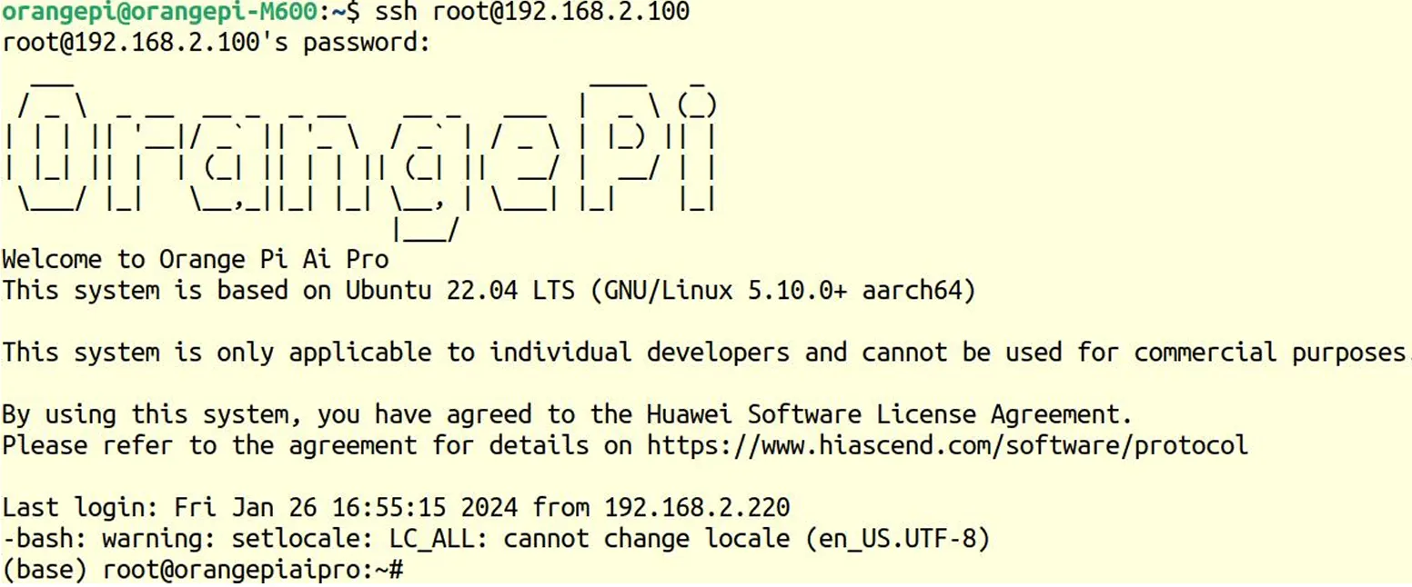 输入香橙派账号默认密码Mind@123。连接成功后打开远程终端,执行并检查是否连接成功