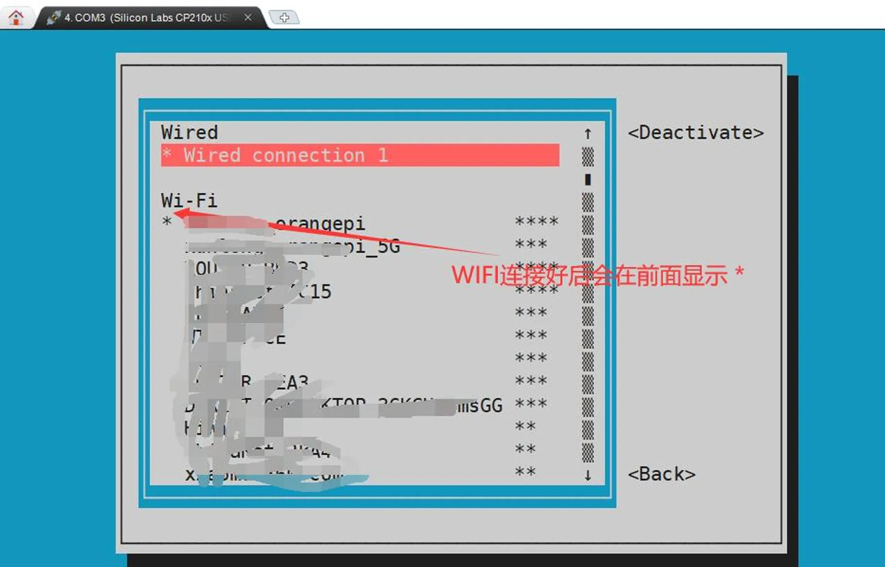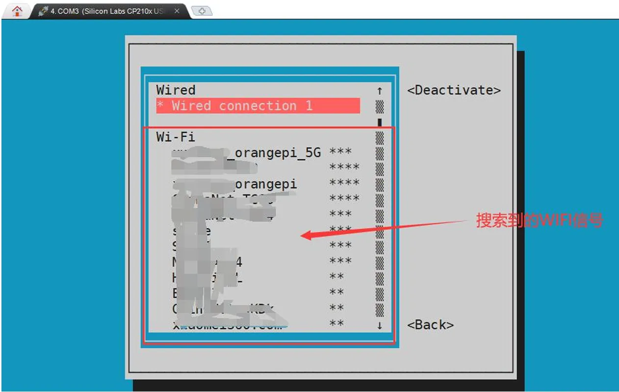 选择Activate a connect后回车,然后就能看到所有搜索到的WIFI热点