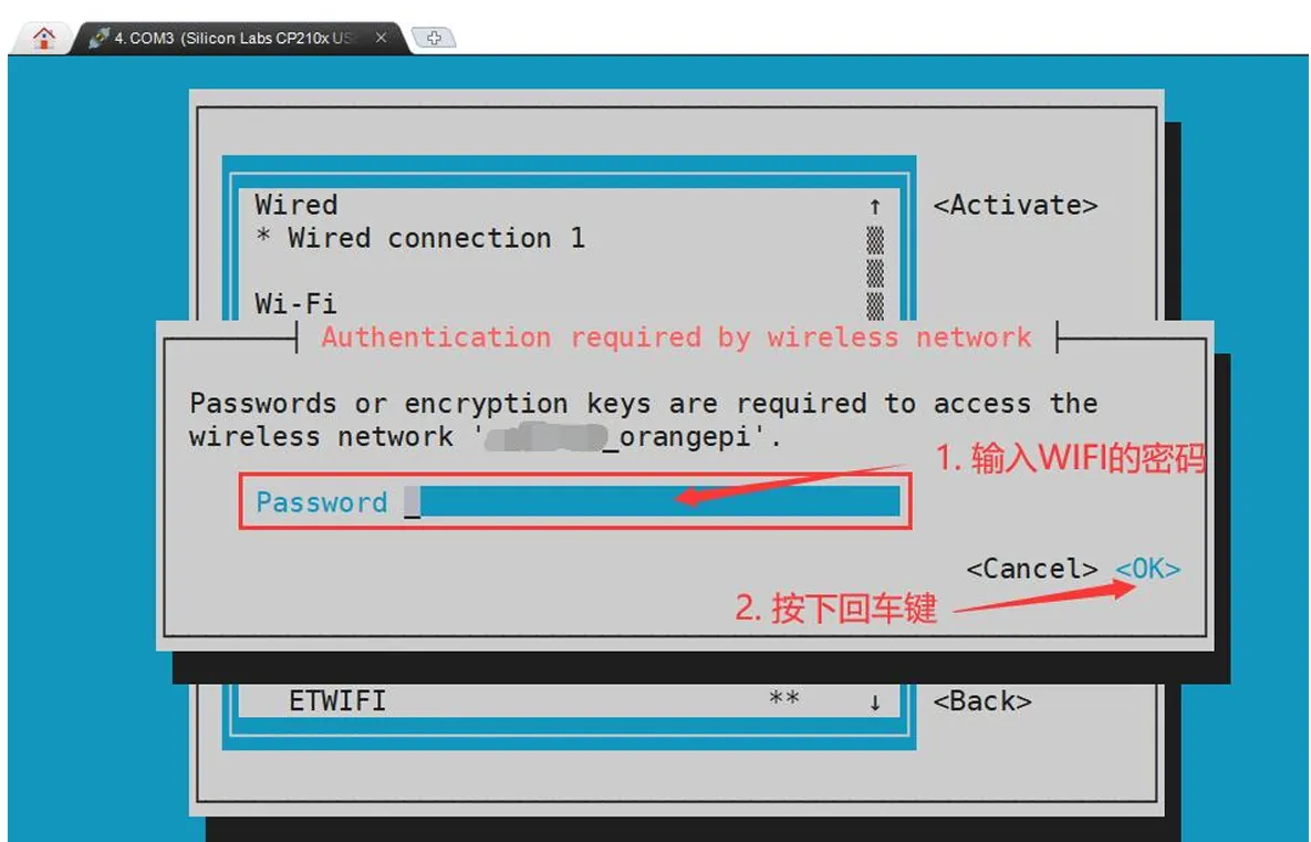 然后会弹出输入密码的对话框,在Password内输入对应的密码然后回车就会开始连接WIFI